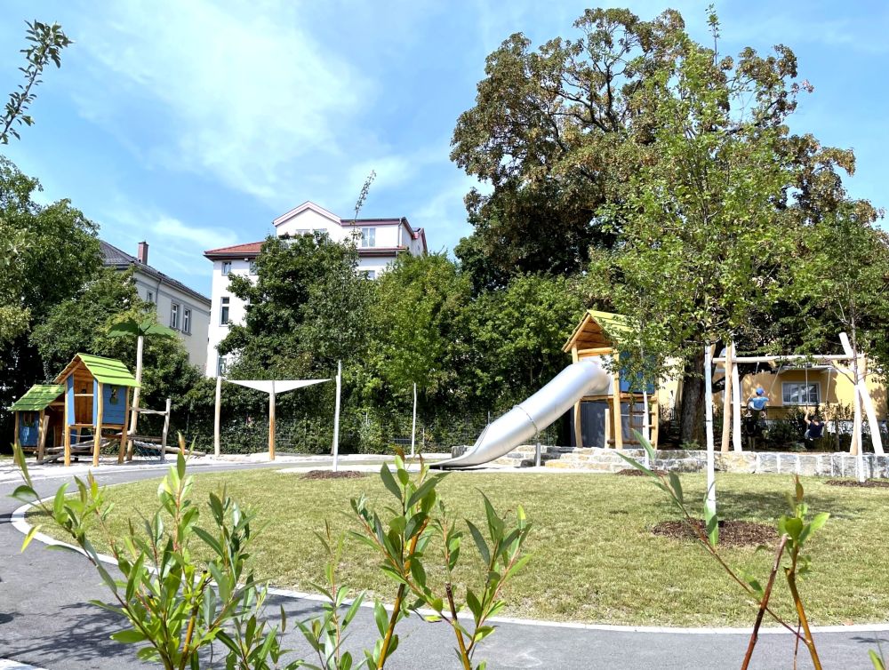 Der Freiraum wurde unter Berücksichtigung des vorhandenen Baumbestandes und der Topografie zu einer naturnahen Spiellandschaft umgestaltet. Das Gestaltungthema „Karibikinsel“ verbindet verschiedene Spiel- und Aufenthaltsbereiche und schafft Raum für Bewegung, Begegnung und Rückzug.